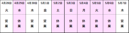 ゴールデンウィーク期間は暦通り(カレンダー通り)のお休みとなります。 期間中はご不便をおかけいたしますが、何卒ご了承くださいますようお願い申し上げます。